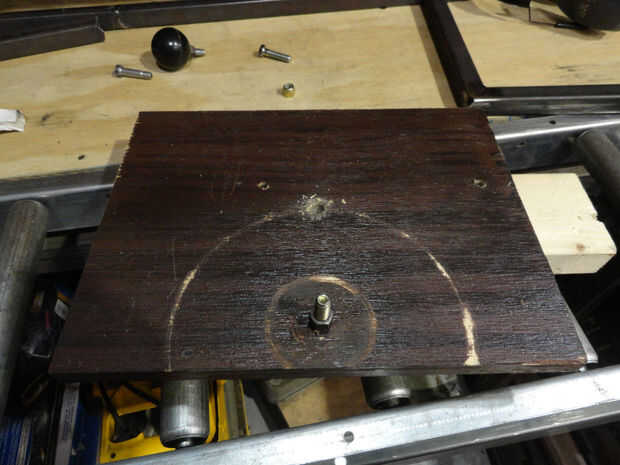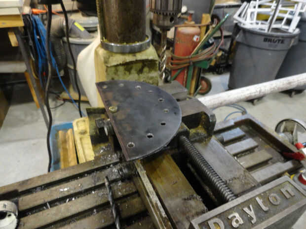 6) del sacador de agujero que hicimos antes, medir 4" a lo largo de la línea central de la placa, hacer un agujero de sacador. Taladro su primer 3/8" en el agujero de sacador que utilizamos para nuestra plantilla de círculo. La placa entonces debe deslizarse justo sobre el perno en nuestra plantilla. Asegúrelo con la tuerca y la arandela. Asegure la sección de 2 x 4 de la plantilla en la mordaza de mesa, con la madera contrachapada en la parte superior. Centro de la prensa, y así la plantilla y el trabajo, sobre los restantes perforar agujero. Ahora puede perforar girando el trabajo sobre el perno en la plantilla, por lo que todos los agujeros se alineen con el orificio inferior, permitiendo que el eje central girar libremente (véase montaje Final).