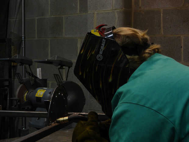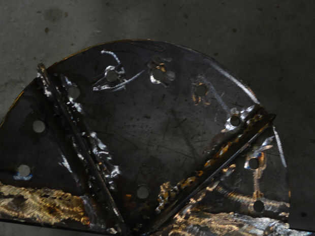 Moler y para pulir las soldaduras como al ras posible, prestando especial atención a la soldadura que esté al ras con la pared lateral del acero. Refiriéndose a los cuadros a continuación, tomar las placas de 8 "x 1" corte en el paso 2 y soldadura de borde en la cara de la placa de ese lado. Será más largos que la circunferencia de la placa. Asegúrese de que el exceso se coloca sobre y soldado a la pared lateral de la unidad de pata. Moler y para pulir las soldaduras como mejor pueda.