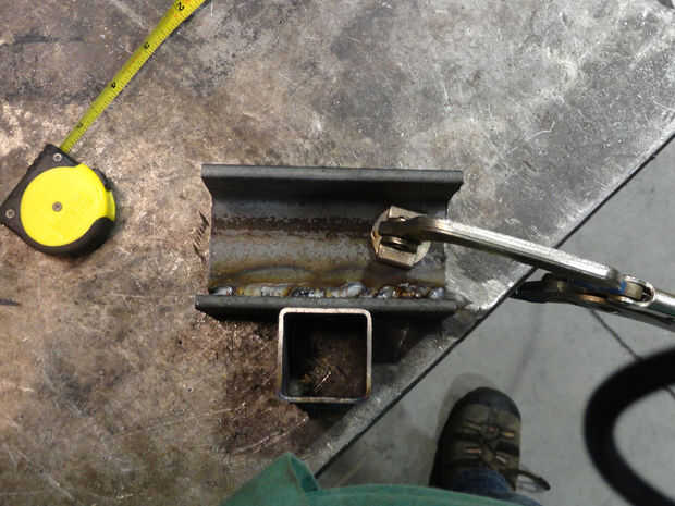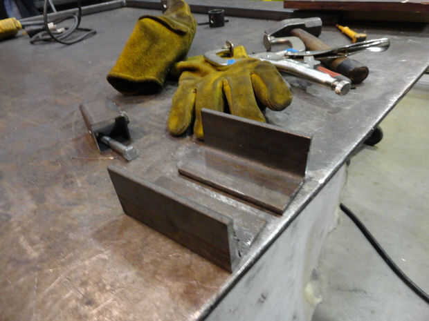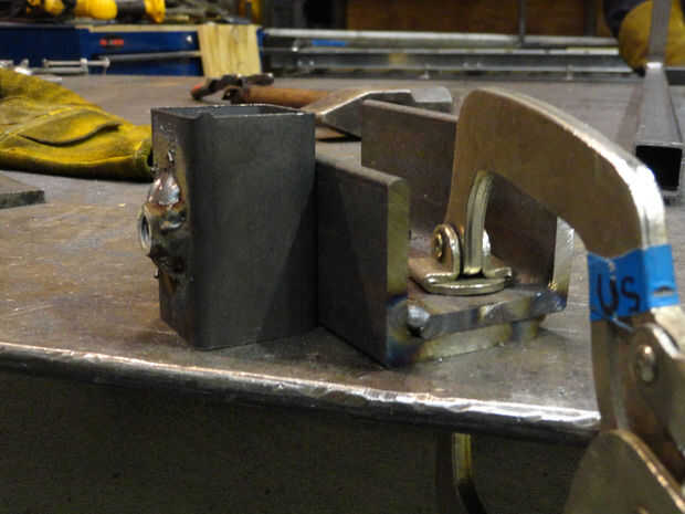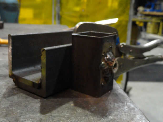 Una vez los. Las Asambleas acero cuadrado se sientan en el borde. En la misma posición como fueron soldados con autógena, lugar las Asambleas de ángulo de hierro al lado de los cuadrados de acero. Se alinean las piezas para que ellos estén centradas horizontalmente (vertical no importa). Asegúrese de que las piezas de hierro de ángulo están haciendo contactarte con la cara opuesta a la tuerca de soldar. Consulte la fotos de abajo. Asegure y soldar las piezas en esta posición. Repita con los otros dos montajes y visten las soldaduras.