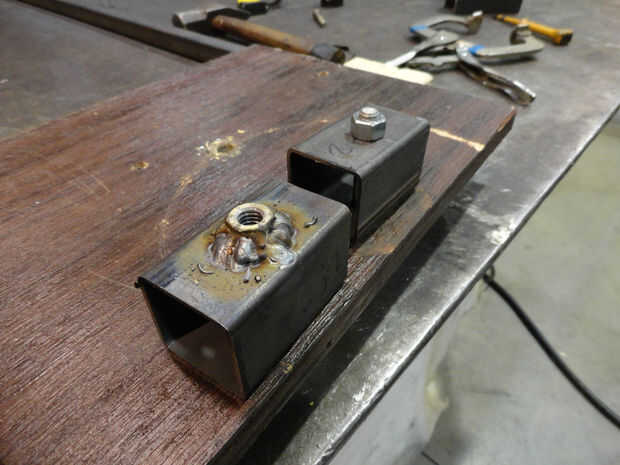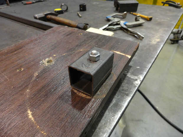 Agarrar el perno de la plantilla de la placa de guía, así como tuercas y pedazos de 1 ½" acero cuadrado cortar y perforar antes. Enrosque una tuerca en el perno hasta la mitad. Inserte el perno en el agujero en el acero. Usando esto como una guía de centrado, soldar con autógena el perno en el acero. Extraiga el perno tan pronto como sea posible. Repita el proceso en la otra pieza de acero y la tuerca con el tornillo mismo. Luego de descartar.