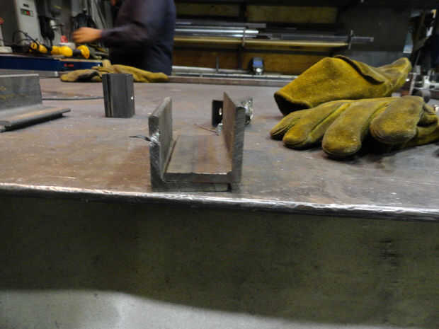 Una vez las piezas, tomar dos de sus cortes de ángulo de hierro de antes. Sobre una superficie plana, coloque un lado encima del otro, para que las piezas forman una forma de "U". Sujetar y soldar los dos trozos juntos en esta posición. Repita con las otras dos piezas. Moler y para pulir todas las soldaduras.