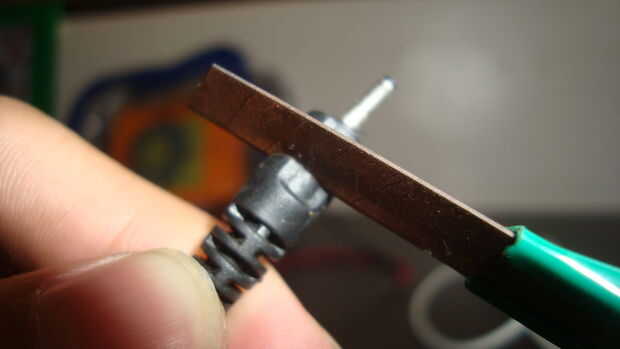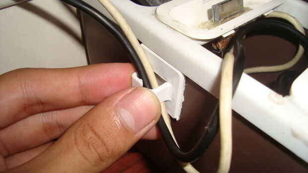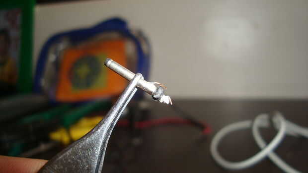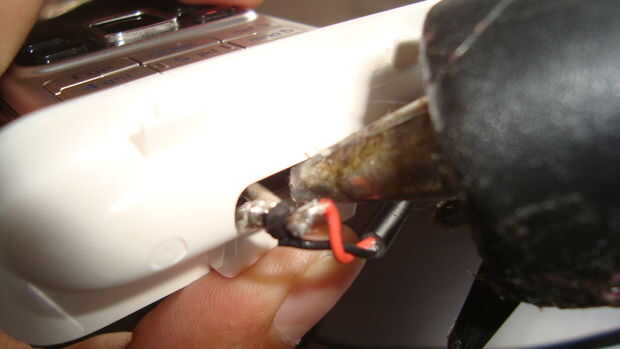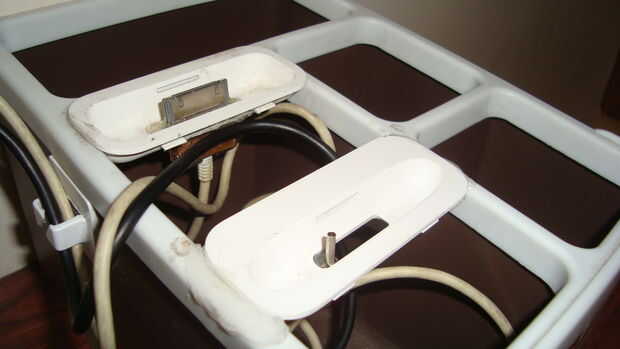 Primer lugar, retire la cubierta de plástico/goma de la cabeza del cargador. Luego suelde los cables rojo y negro del cable USB en la cabeza [ver diagrama]. Luego pegar la cabeza sobre el dock del iPod y el muelle en la caja. Asegúrese de que todo está alineado antes de dejarlo enfriar.