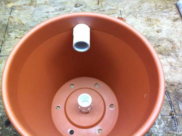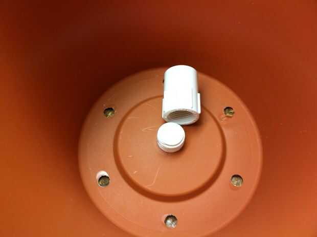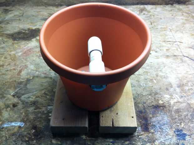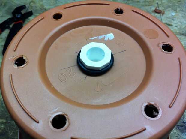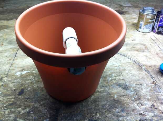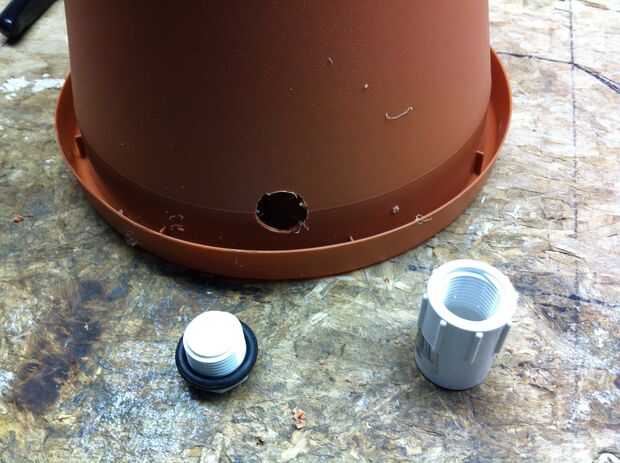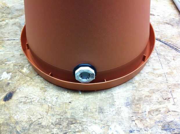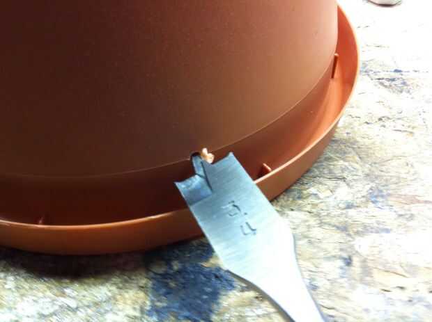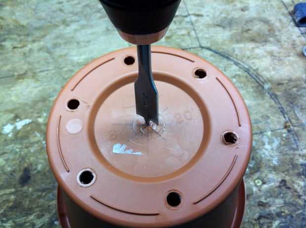 1 - Perfore un orificio de 3/4" en el centro inferior de la maceta y alrededor 1" desde el borde de la maceta.