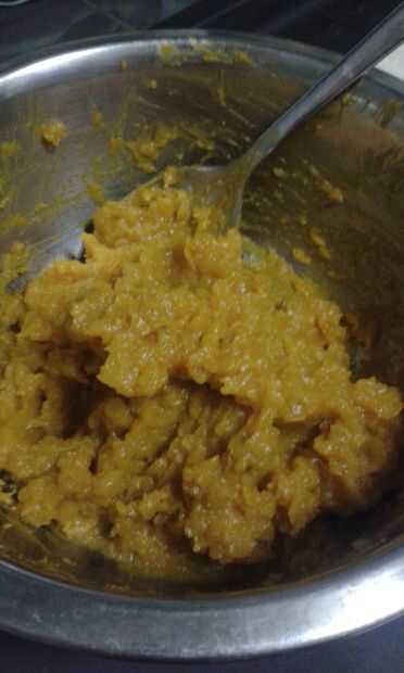将已切成四分一的南瓜洗净, 不必去皮, 切成小块, 然后水蒸15至20分钟。 当南瓜蒸到软化后, 用汤匙把瓜肉和皮分开, 将皮丢弃, 瓜肉放入碗中均匀按压成酱状, 加入少许盐及橄榄油调味。