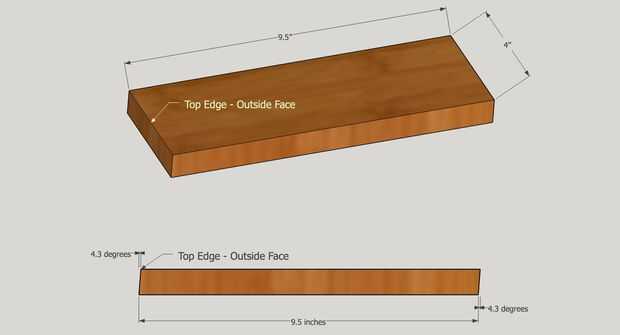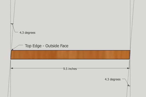 La tabla de la inclinación del disco a 4,3 grados. Puede establecer el ángulo fácilmente utilizando la plantilla que hiciste en el paso anterior. Luego corte las piezas de madera cuatro dura utilizando el calibre de ingletes Sierra de mesa. Que los ángulos en ambos extremos de cada pieza pendiente en la misma dirección, y todas las piezas tienen la misma longitud. Estudio del diagrama y marcar sus piezas antes de realizar el corte transversal ocho. Es muy fácil confundirse aquí!