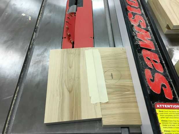 La tabla de la inclinación del disco a 45 grados. Coloque la plantilla sobre la mesa Sierra, lado 1 borde recto contra lateral y canto más largo (3") a la hoja como se muestra. Alinee la pieza de madera marcado contra el borde afilado de la plantilla, rubor en la parte superior. La cara externa de la pieza de madera dura se enfrenta, y el borde superior enfrenta a la hoja. Es muy fácil cometer un error aquí, así que asegúrate de que todo está alineado correctamente. Cinta la pieza de madera dura a la plantilla por lo que se mueven juntos durante el corte. Ahora ajuste el tope-guía para cortar el borde del lado izquierdo de la pieza de madera dura, basada en sus marcas de diseño. Repita para las tres partes restantes con la misma configuración de cerca. Salvar a uno de los cortes.