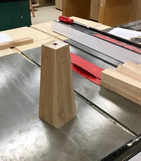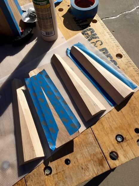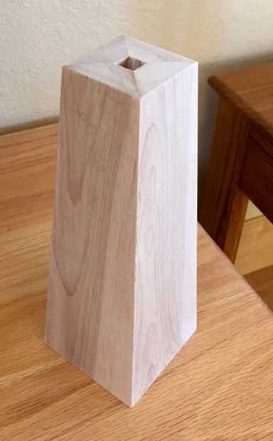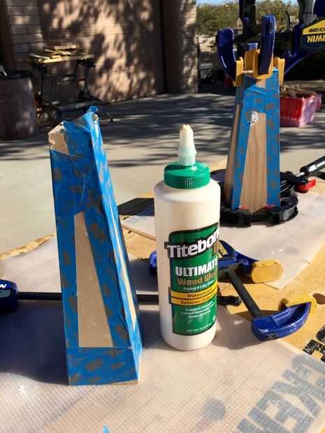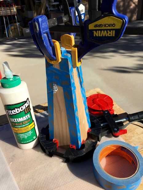 Las cuatro piezas deben encajar muy bien si simplemente deje les sobre una mesa plana. Unte el pegamento en los bordes inglete de cuatro piezas. Arme y utilice masking o cinta a lo largo de los bordes exteriores del embalaje para unir la lámpara base durante el pegado. Utilicé algunas abrazaderas, pero no es necesario; y puede realmente estropear le puesto que no tienes ninguna buena superficie sujeción perpendicular entre sí. Podría hacer algunas cuñas de 4,3 grados para facilitar la sujeción; pero te recomiendo: pegar con cinta adhesiva sólo para el pegamento. Si hice un obelisco más grande utilizo galletas en las juntas a inglete.