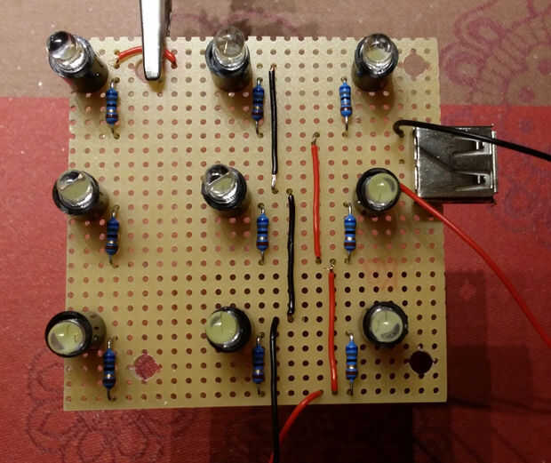 El circuito consta de 9 LEDs blanco brillantes con resistencias de caída adecuada y un conector USB-A para fuente de alimentación. El disyuntor es adherido a la caja y conectado al circuito.