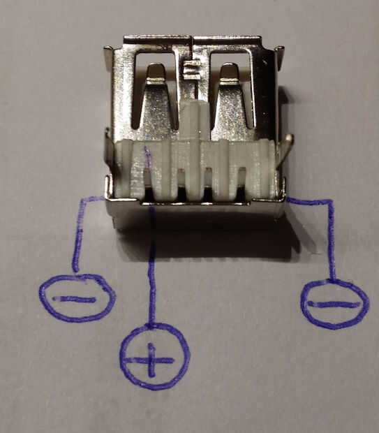 3. para conectar el interruptor, cortar 4 piezas de cable (2 x rojo y negro 2 x) y tira al final. Uno de los extremos de los cables negros en el lado negativo del conector USB y las rayas negativa del circuito de la soldadura. Hacer lo mismo con los dos cables rojos por soldar el lado positivo del conector USB y las rayas positivo del circuito.