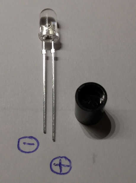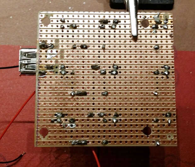 2. Si es necesario, limpiar las rayas cobre con desengrasante. Coloque los componentes en el tablero como se muestra en la fotografía. Tenga en cuenta la polaridad de los LEDs y el + 5, 3V pin del conector USB. Coloque también los 4 puentes (2 x en rojo) y 2 cables negros en el tablero. Empezar a soldar, luego corte las patas de los componentes.