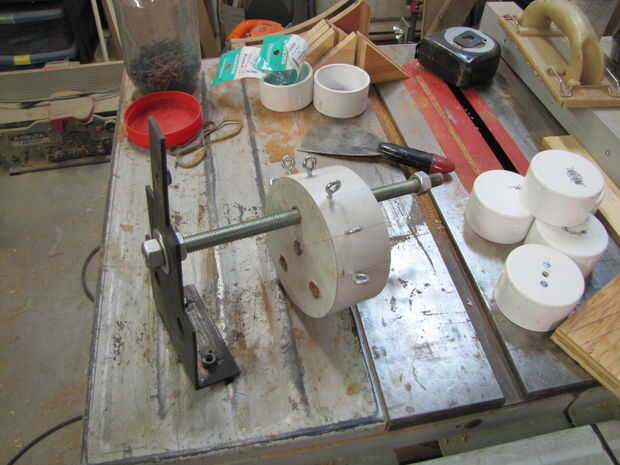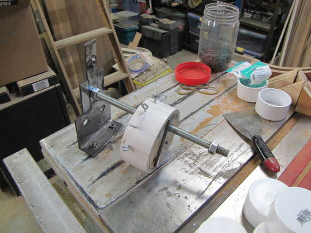 Después de establecer la longitud de la varilla roscada para el tornillo de elevación, había determinado la ubicación de las 3 tuercas. Una tuerca en la parte inferior sirve como soporte vertical para la varilla roscada. Los dos en la parte superior Fije la varilla en el soporte superior. Con las tuercas ubicadas en la barra, perforé un agujero de 3/16" a través de cada uno para permitir la instalación de pernos de rodillo para bloquear en lugar.
