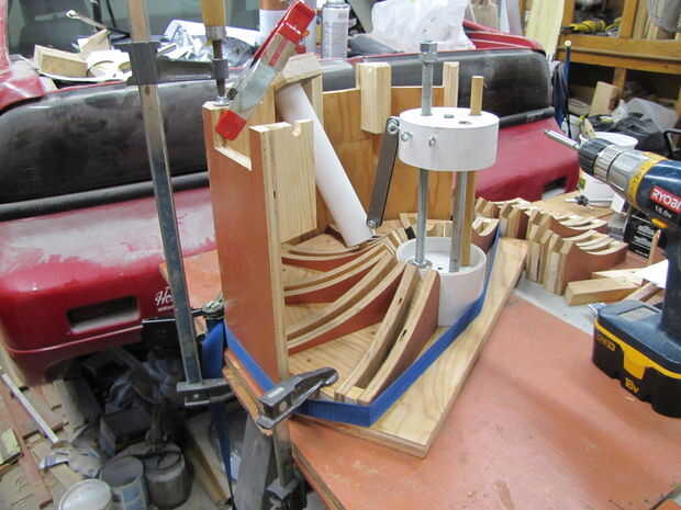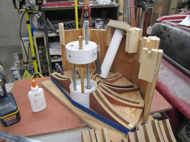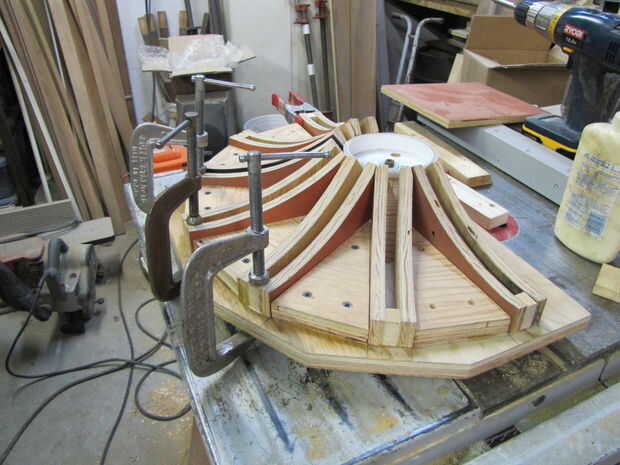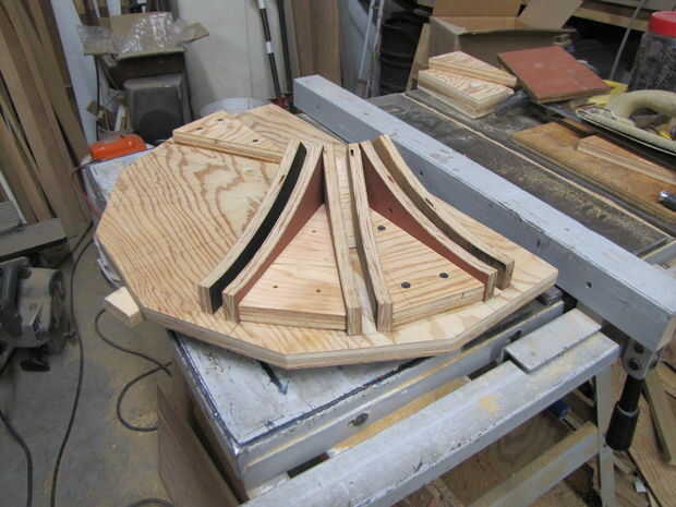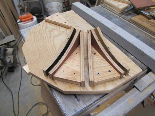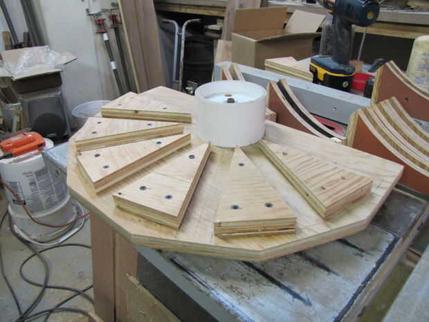 Luego pegado y tornillo terminado disco base y guías de apoyo a la parte inferior de la madera contrachapada de la bandera.