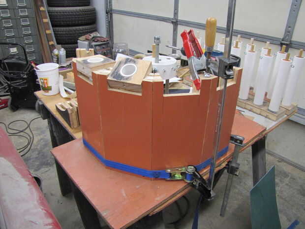 Después de recortar los paneles de facetas para adaptarse a los bordes del panel inferior, he pegado en su lugar, asegurado con una pinza de la correa de trinquete y sujeta la parte superior con abrazaderas de resorte. He trabajado con solo dos o tres facetas a la vez. Cuando estaba satisfecho con su alineación, los atornillados en su lugar utilizando tornillos en el borde de la parte inferior de la madera contrachapada para ayudar a mantener la alineación mientras el pegamento seca.