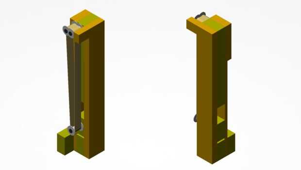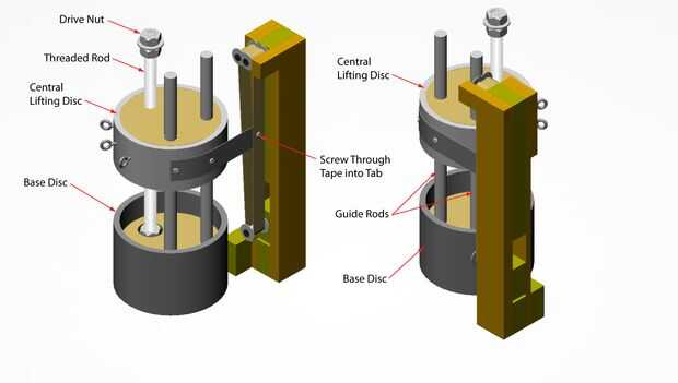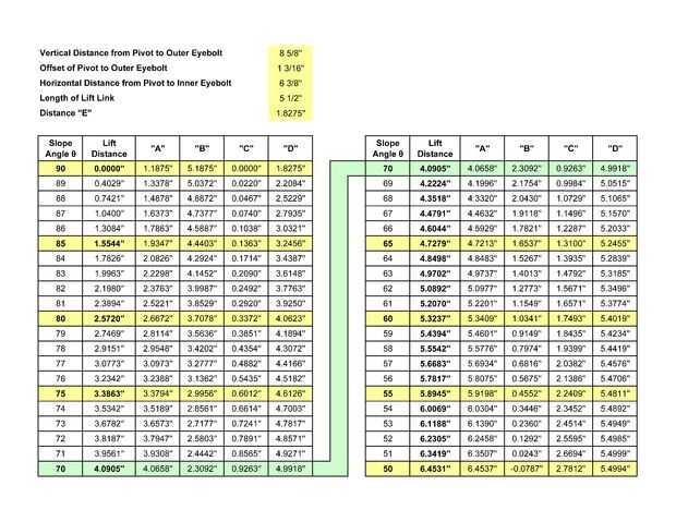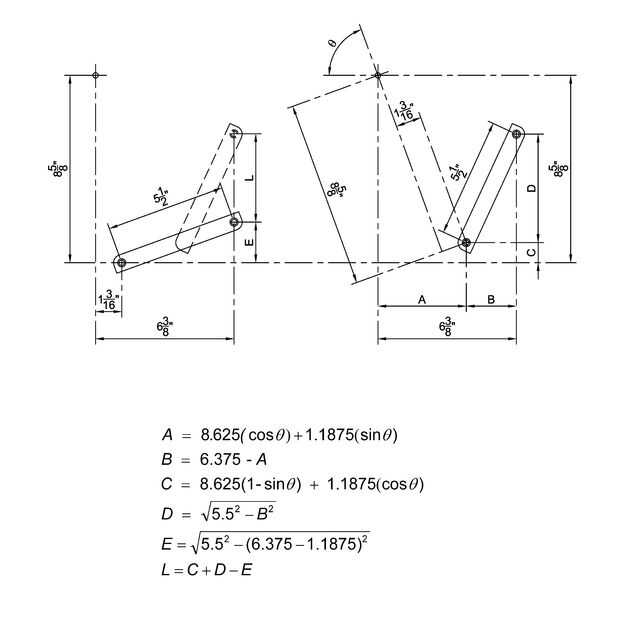 El aspecto más desafiante de esta parte del proyecto es la generación de la escala a imprimir en la cinta. La naturaleza del dispositivo de elevación resulta en una relación no lineal entre el movimiento vertical del disco central de la elevación y el ángulo de los bolsillos de soporte de la bandera. Con el fin de establecer la relación matemática, muestra un diagrama de la geometría; etiquetado las constantes y variables; elaboró las relaciones trigonométricas; y las ecuaciones asociadas. Entré en estas ecuaciones en una hoja de cálculo Microsoft® Excel que he creado para generar la distancia de elevación necesaria para hacer rotar los bolsillos de apoyo de bandera para cada ángulo medido respecto a la horizontal. Esta distancia va desde 0.0000"(sin ascensor) de 90 grados (verticales) hasta 6,4531" de 50 grados.