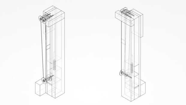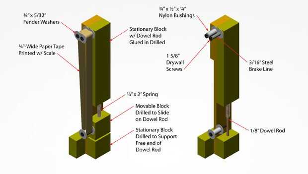 El indicador de ángulo de pantalla consiste en un lazo de cinta de apoyo de rodillo de papel impreso con una escala graduada en incrementos de 1 grado. El circuito está conectado a una pestaña que se extiende desde y se acciona mediante el disco de elevación central. La cinta de papel se mantiene tensa por medio de un resorte que empuja contra el soporte deslizante del rodillo inferior. Hay dos rodillos en la parte superior de la Asamblea para que esta área de la cinta graduada se muestra plano. Los rodillos son bujes de nylon con rodamientos de segmentos cortos de línea de freno de acero. Las arandelas de defensa mantienen la cinta en su lugar, y tornillos para fijar todos estos componentes en la estructura de soporte de madera.