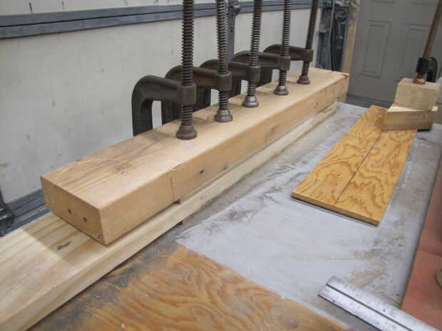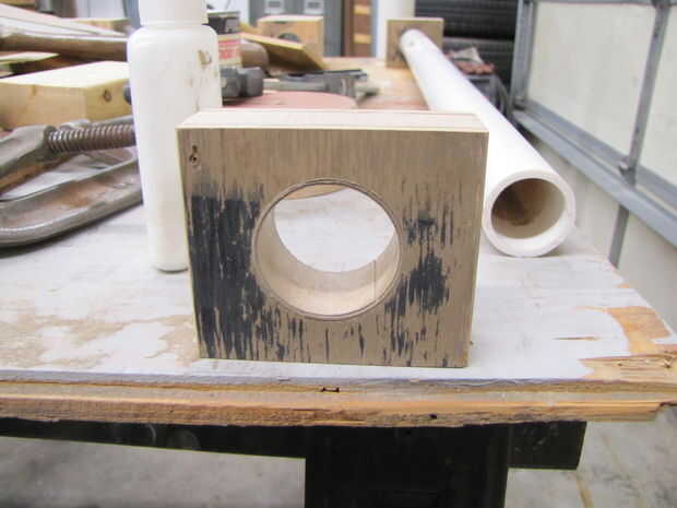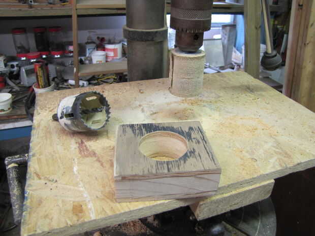 Después de pegar una capa de madera contrachapada de ¼" a cada lado de una longitud de pino claro y permitiendo que el pegamento seco, los conjuntos de pivote de madera pino son aserrados aparte y un 1½" el diámetro del agujero aserrada en cada uno. Los orificios aserrados son luego lija suave.