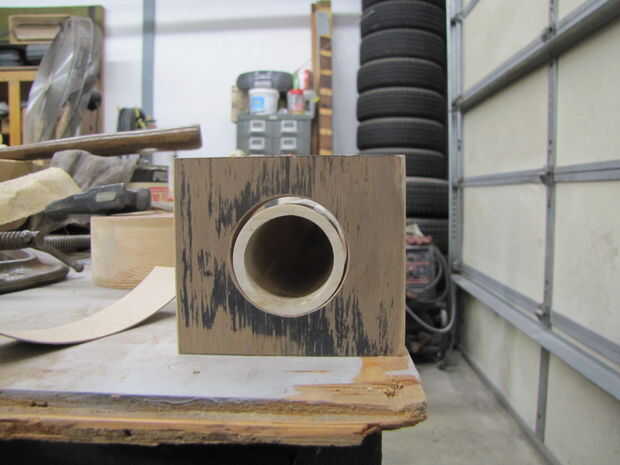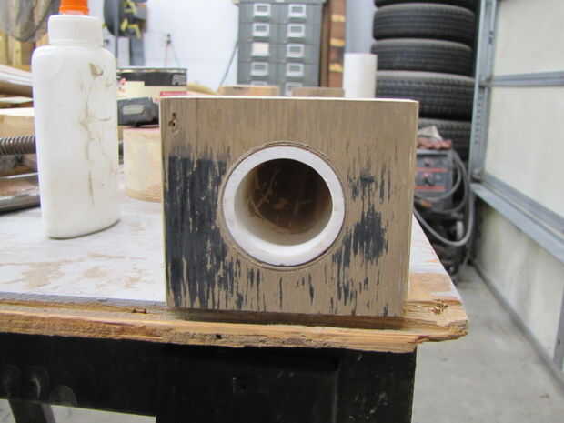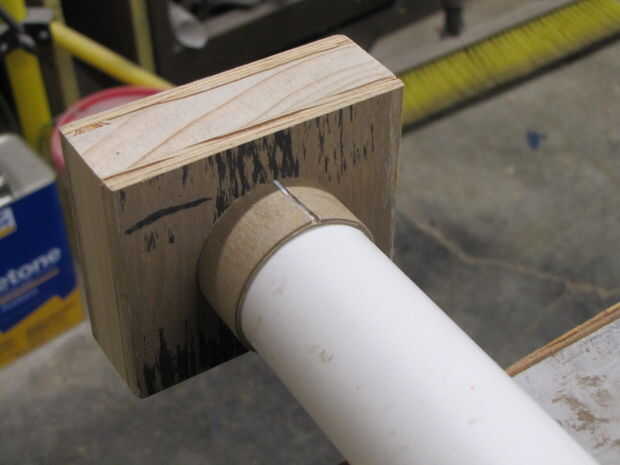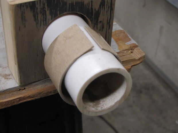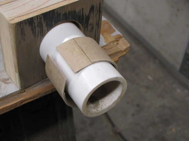 Los agujeros terminados en las Asambleas de pino contrachapado será ligeramente más grandes que el diámetro exterior de la 1¼" del PVC. Para que encajen perfectamente, ha acuñado el espacio anular con tarjetas o tiras de cartulina. El espacio típico requiere dos capas de cartón. Yo corte con cuidado las dos longitudes que los anillos de ajuste tanto como sea posible tener ni un boquete grande ni superposición de extremos que daría lugar a deformaciones del anillo cuando está montado. Dispone las capas y luego pegar las capas junto con el desplazamiento de las costuras. I luego pegar la vuelta, cubrió la superficie con pegamento, inserta el anillo en el orificio de aserrado y enarenado, una insertada el PVC para mantenerlo en su lugar mientras el pegamento seca. Pegar el PVC a la cartulina.