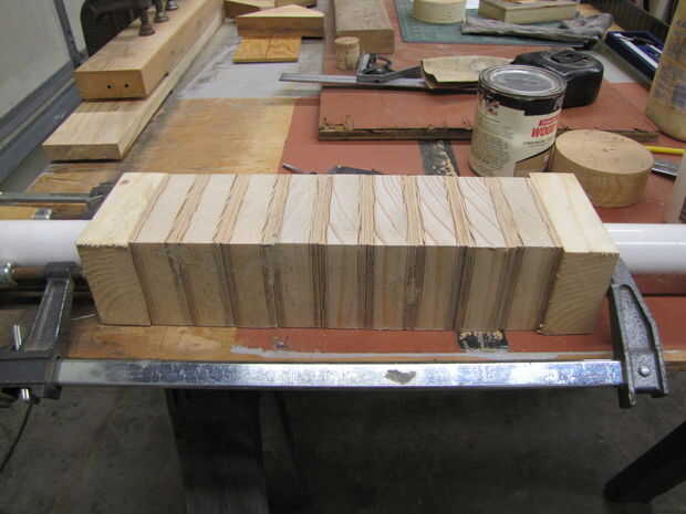 Después tuve varios conjuntos de pivote completados hasta el punto de la cuñas cartón pegado en el lugar, lijar las caras liso quite cualquier cartón que se extiende más allá del plano de la madera de ¼". Después puso a un grupo de ellos en un tubo de PVC, les afianzado con abrazadera juntos y lijar todas las superficies de borde suave para tratar de hacerlos a todos el mismo perfil.
