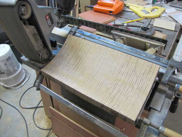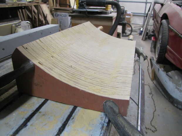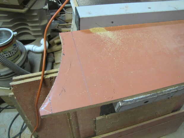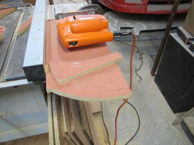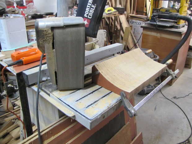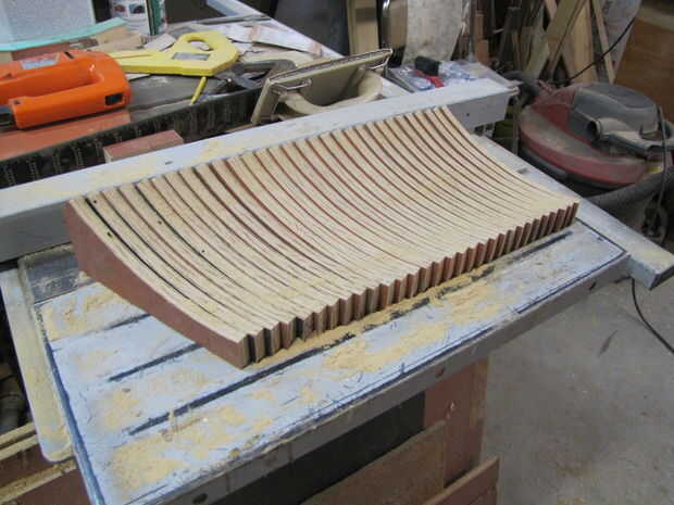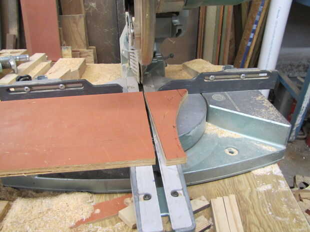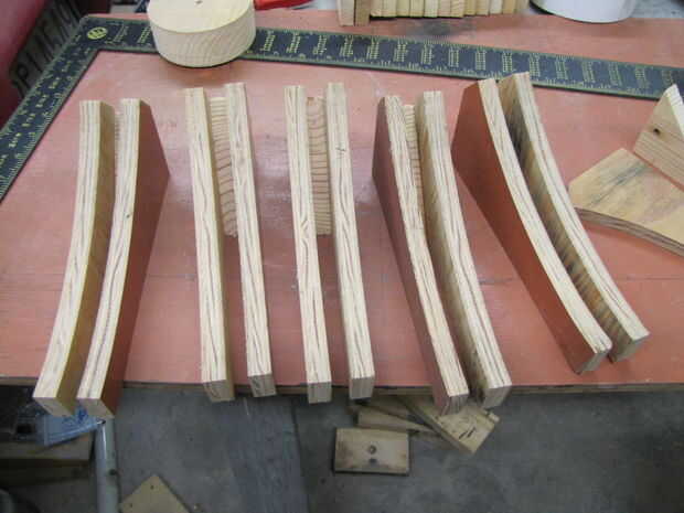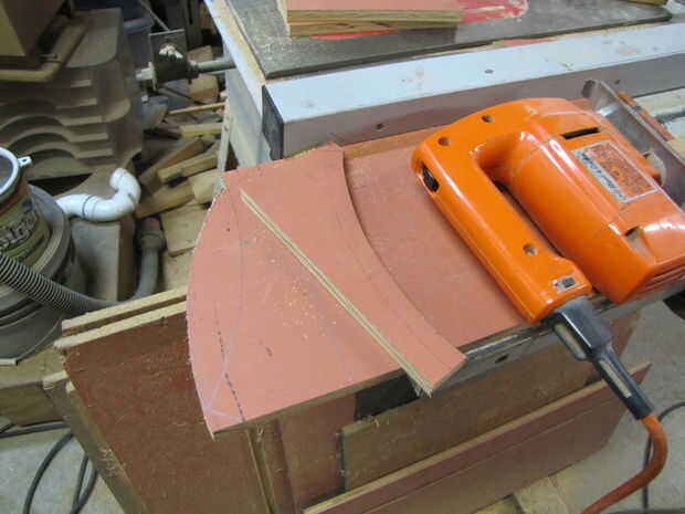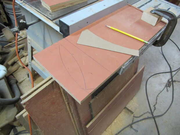 Imprimir un patrón en cartulina, monta el patrón en cartulina y recortar con un cuchillo. Usando el patrón, traza la forma de una pieza ½" madera contrachapada que ya había rasgado a la anchura de las secciones del vestigio. Puse las piezas para que los cortes curvos enfrentaron para minimizar el desperdicio. Usando un sable Sierra, hice pares de cortes curvos, seguidos por un corte recto con una sierra de inglete deslizante, alternando hasta que fueron cortadas todas las piezas. Luego todos juntos les sujeta y utiliza el extremo de una lijadora de banda para dar forma y alisar todas las curvas al mismo tiempo para que sean efectivamente idénticos.