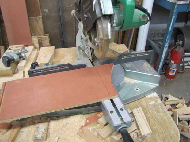 Cortar a los espaciadores de madera que planeado ½" espesor ½" madera contrachapada también podría usarse para este propósito. Las fotos sólo muestran al espaciador triangular en el extremo interior de la pista. También hay un pequeño espaciador en el extremo exterior, que establece el límite exterior de la clavija de guía inferior cuando el bolsillo de soporte de la bandera en posición vertical.