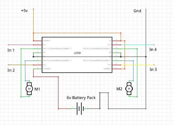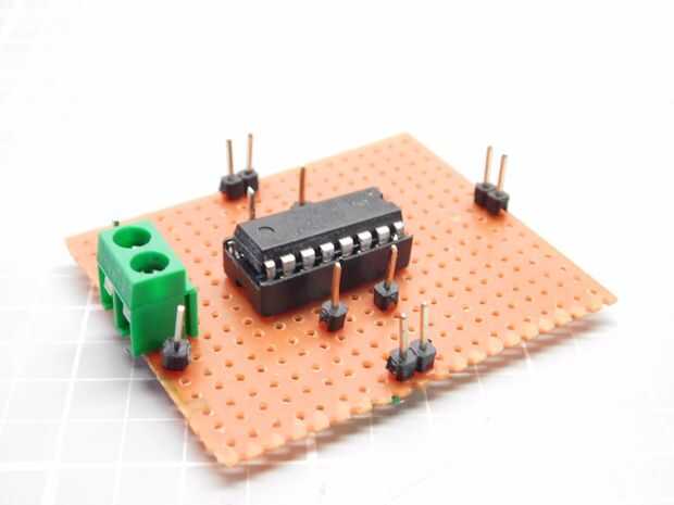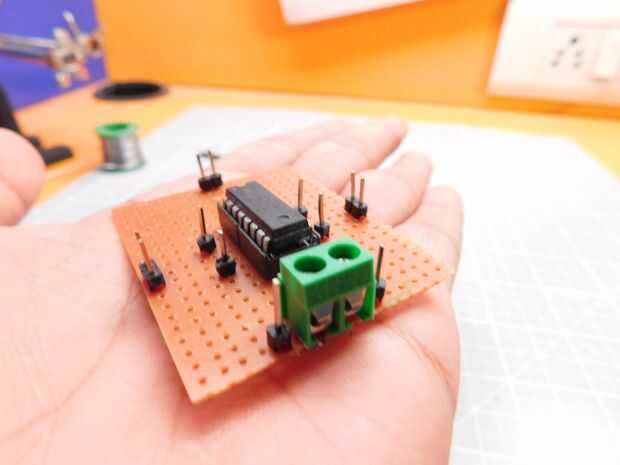 Aparte de la IC, necesita soldar 2 par de cabeceras masculinos, cada uno por un motor. 2 pares más para la señal de entrada para cada motor. Un par de + 5v y Gnd alimentación el IC y por último, un conector de tornillo para la alimentación de los motores. Las dos cabeceras adicionales al lado de la terminal de tornillo son simplemente conectadas a él para obtener una fuente de salida de la batería conectada. Tenga en cuenta que la batería conectada sólo se utilizará para alimentar los dos motores. El controlador IC conseguirá un separado 5v para funcionamiento interno.
