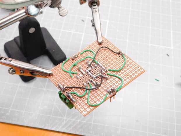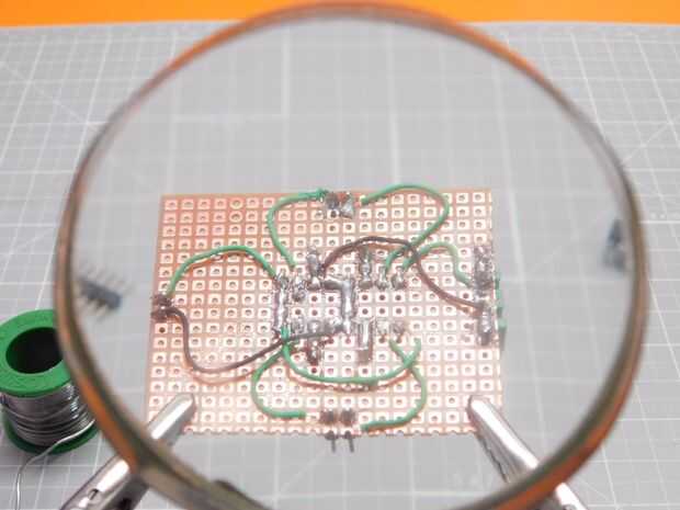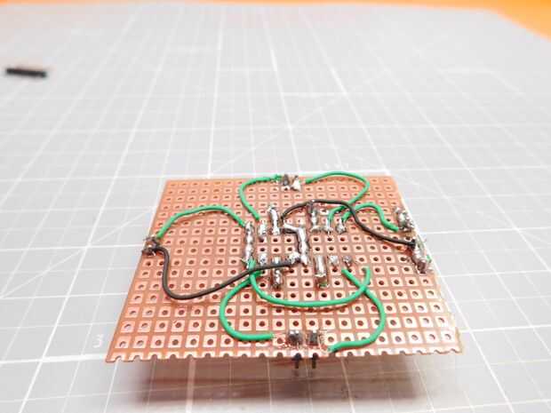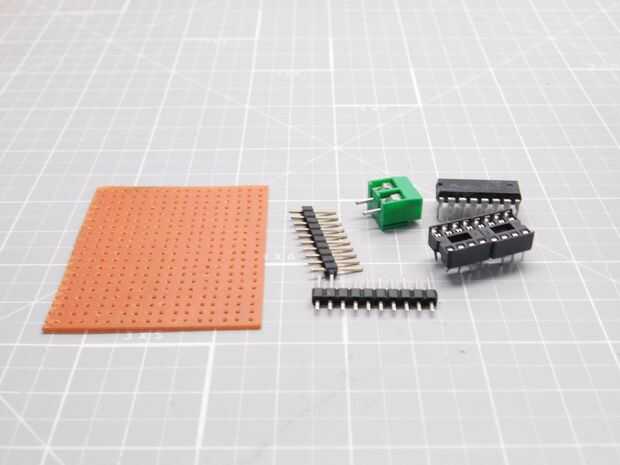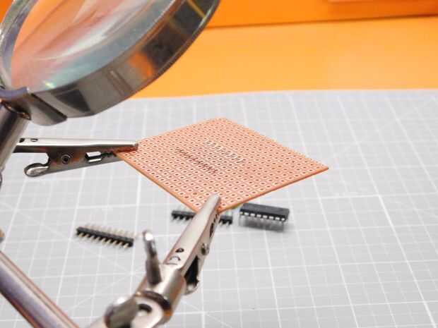 Comienza por cortar pequeño trozo rectangular de perforado o protoboard. Soldar todas las piezas como se indica en el esquema anterior. Asegúrese de usar un zócalo del IC para el chip controlador para reducir el riesgo de quemarlo. Si quieres hacer el proceso más simple, incluso puede grabar su propio PCB en vez de usar los cables para las conexiones.