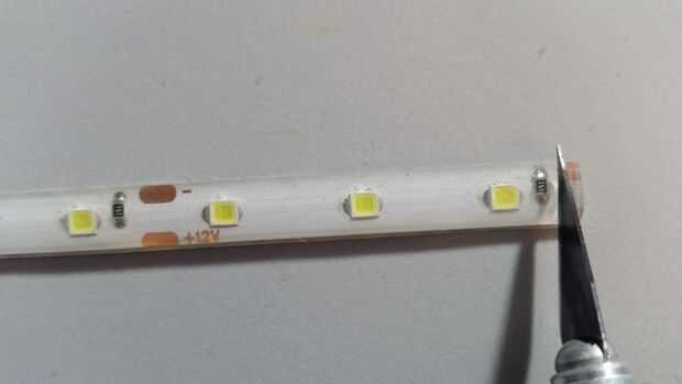 Las tiras de LED se pueden cortar en secciones. Generalmente es cada 3 LED, tope Asegúrese de verificar antes de cortar. Tienes que cortar tan directamente como sea posible para evitar lamentar el siguiente conjunto de leds. Si demasiado, y no puede conseguir un punto de soldadura buena entonces mover esa pieza hasta el final donde usted necesita solamente un lado de la soldadura.