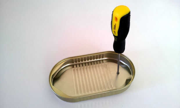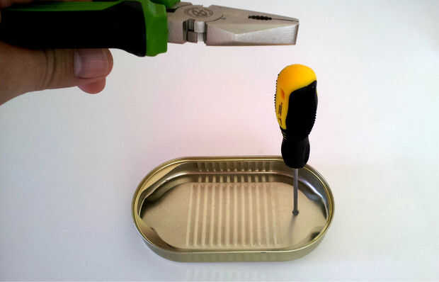 Hacer un agujero en la lata. Usé un destornillador y los alicates (sí, soy barato: no tengo un martillo. Tratar con eso). Tenga cuidado de no hacerlo sobre una superficie que puede estropear, como tabla de cena de la abuela tiempo soviético. Aprender de mis errores.