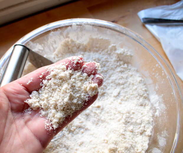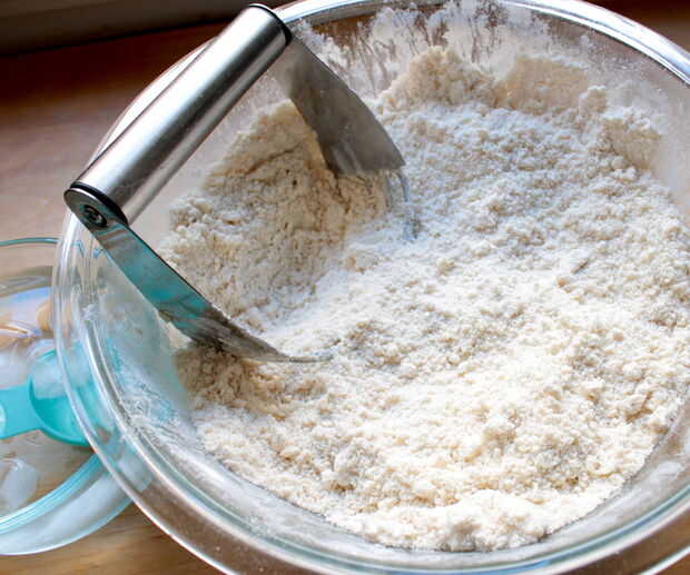 Corte el registro grasa de tocino en mitades y cortar una de las mitades en trozos. Ponga los trozos en el recipiente y en la harina usando el cortador de pastelería. Seguir cortando hasta que quede la consistencia de migajas, en la foto.