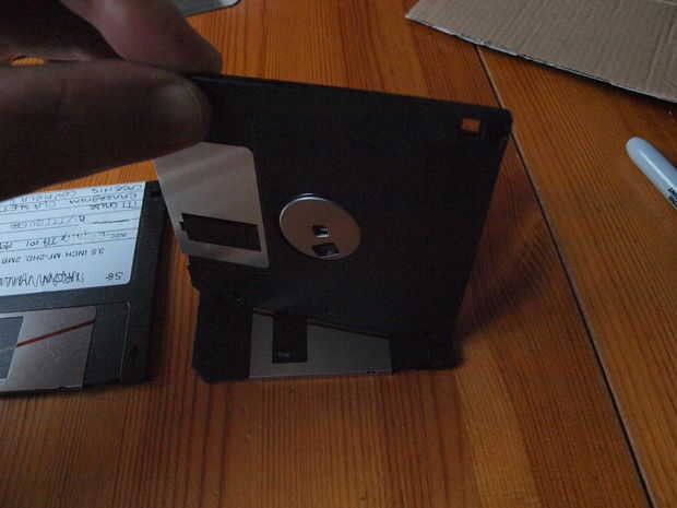 Colocación de las piezas laterales, ofrecen hasta el borde largo de la pieza base ancho corto de la pieza lateral. La diferencia entre las longitudes da una buena indicación del mejor ángulo para la base. Alinee los bordes de la base disquete se alinee con los bordes del lado de la pieza y trazan una línea con un lápiz.