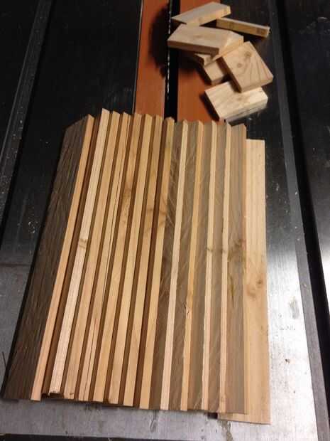 Cada franja fue reducido a 1-1/4" W x 1/4' x 10" L. Esto significa que ahora tengo 14 tiras para trabajar con los 7 originales.
