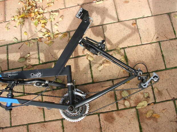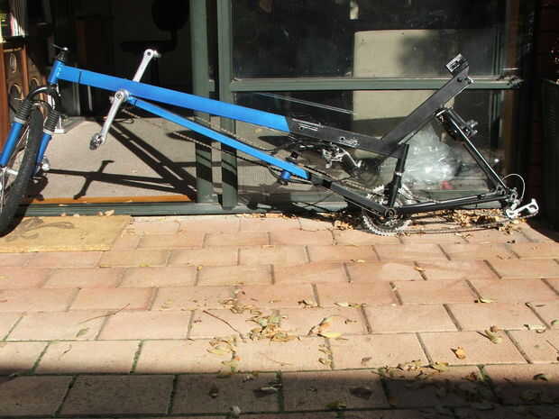 Comienza por cortar el triángulo trasero de la moto más grande, incluyendo el tubo del asiento y caja de pedalier, soldar un tramo de 1,3 m de tubo de acero de sección rectangular 50 x 25 mm en ángulo recto con el asiento tubo de 175mm por encima de la caja de pedalier. Este es ahora el nuevo tubo superior para el decúbito.