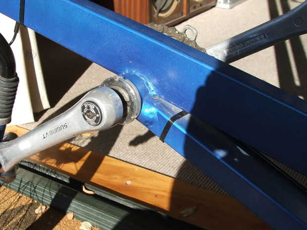Para unirse a la parte superior tubo y el tubo hacia abajo primero cortan una ranura de 25mm de ancho en el centro del soporte inferior delantera. El tubo superior se ajusta en esta ranura y se suelda con autógena el tubo hacia abajo al resto de la estructura (que esto es claro una vez que han analizado las imágenes). Ahora a presentar el tubo superior que sobresale dentro de la caja de pedalier para permitir espacio para el funcionamiento del soporte inferior.