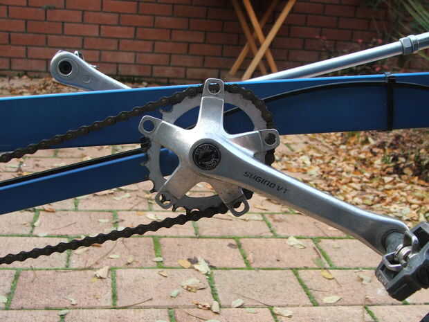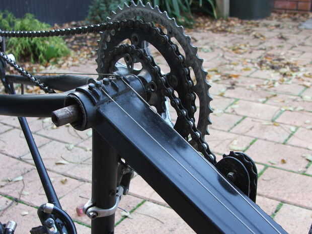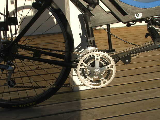 La construcción es hacia adelante. Cortar el brazo de la biela de una de las manivelas del anillo triple cadena y archivo nuevo liso para crear la unidad de intermediaria. Quite el anillo de la cadena interna y añadir algunas pequeñas arandelas para moverlo lo suficiente desde el anillo de cadena media para que no haya interferencias entre la cadena delantera y la trasera cadena.