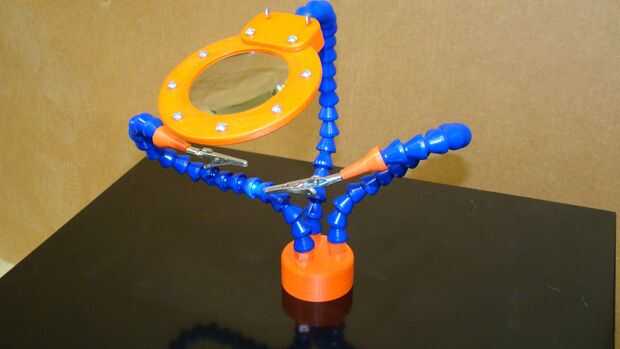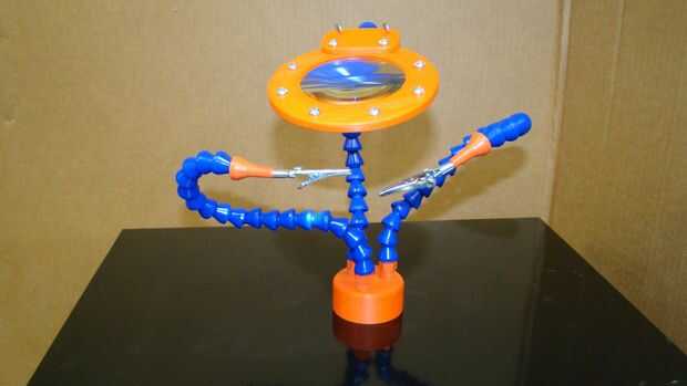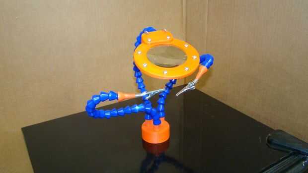 Manos con lupa y pinzas que se pueden colocar en cualquier posición. Este sistema utiliza una base magnética que funciona bien con la estación de trabajo móvil BH-1. Base y soporte de vidrio son piezas impresas 3D. Si no tienes una impresora 3D, ponerse en contacto conmigo y aprender a adquirir un conjunto propio.