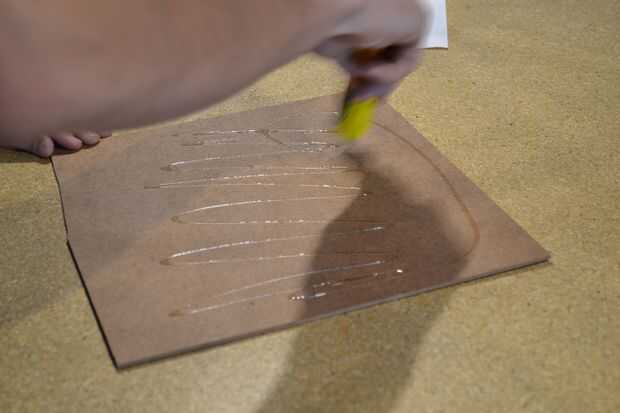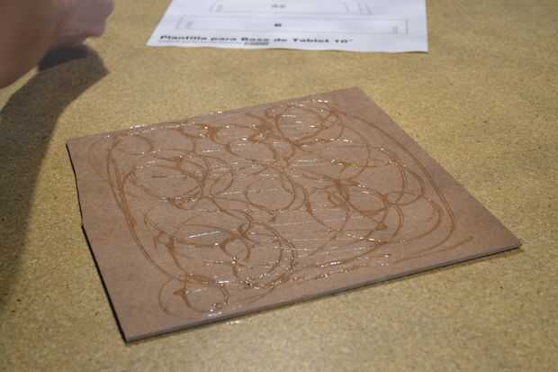Colocamos el pegamento sobre el MDF (procuraremos utilizar un pegamento que no adhiera mucho porque después necesitaremos retirar la hoja de papel), colocamos la hoja sobre el MDF y nos quedará como en la cuarta foto.