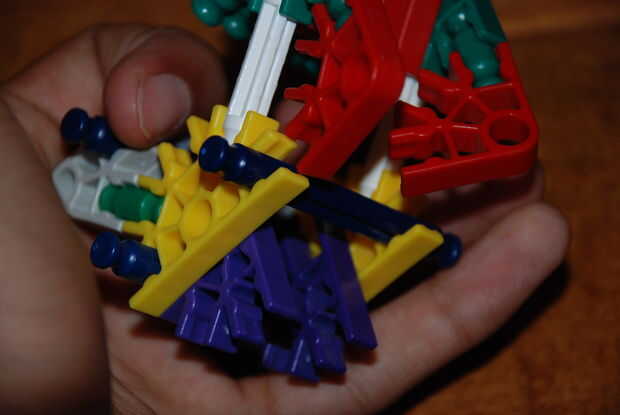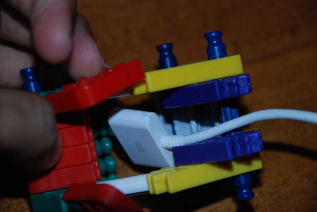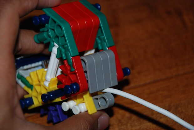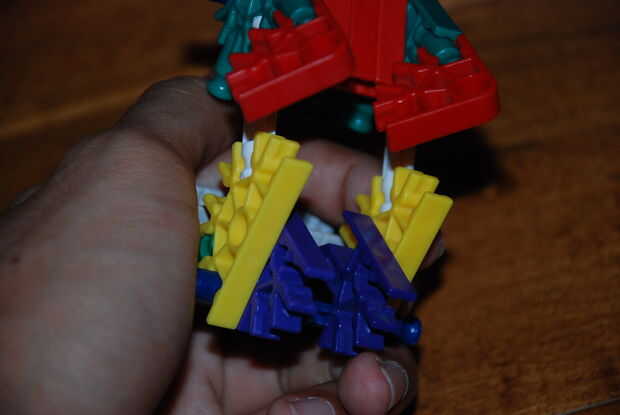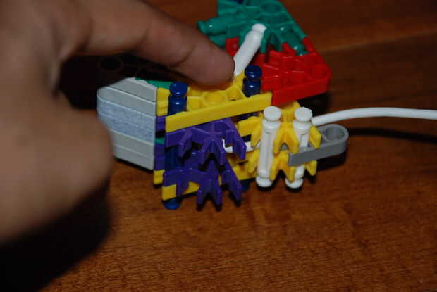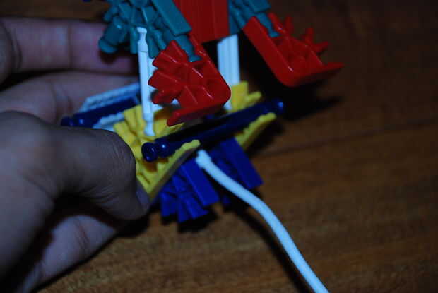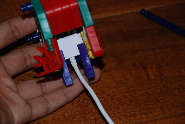 Paso 9: poner el trozo maade de la primera imagen y colóquela aquí. los extremos de las barras de azul deben quedar a través de los orificios de los conectores rojo