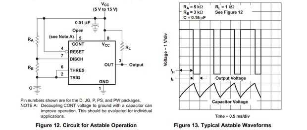 La configuración básica de modo el monoestable y astable se muestra en las imágenes de arriba de la hoja de datos de la NE555(Texas Instruments)