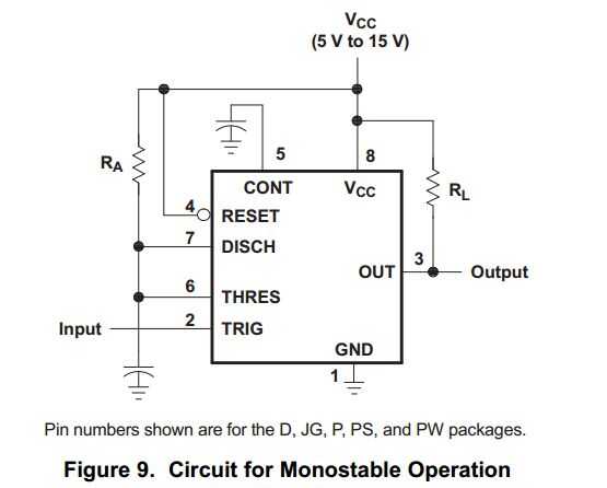 Para un monoestable, el programador crea un retardo de tiempo cambiando su salida alta para toda la duración de la demora. Este retraso es accionada por una entrada externa al Pin 2 del IC. Cuando la clavija de entrada baja, comienza el retardo de tiempo. La duración de la demora depende de los valores de la resistencia externa y el condensador y se calcula mediante la fórmula: