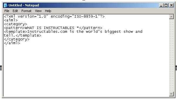 Los caracteres comodín coincidirá con infinidad de palabras (y, por supuesto, de entrada preguntas) como ¿qué es ¿Qué es instructables en Internet? ¿Qué es unicidad de instructables para otro sitio web hágalo usted mismo? etc. Todas estas preguntas serán respondidas por AIML según la plantilla de esa categoría coincidente: Instructables.com es mostrar y contar más grande del mundo.