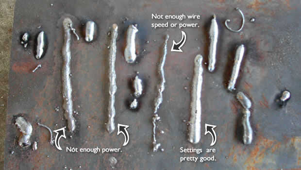Antes de la soldadura en el material que debe ser su producto terminado. Le sugiero tomar algunos chatarra de acero de similar grosor su proyecto, y práctica con el material que usted no importa. También es una buena idea llevarlo cortadores de alambre y cortar el extremo de su cable después de dejar de una soldadura. Ajuste el soldadores hasta que la soldadura se ve correcto, que esto incluye el flujo de gas protector (si desea utilizar un cable de núcleo sólido). Estándares de la industria para un MIG, soldadura de boquilla de la pistola con un diámetro interno de 1/2" está entre 20-28 CFH (pies cúbicos por hora) la práctica en el desecho algunas veces para obtener la sensación de cómo está funcionando el soldador. Potencia, velocidad del alambre y velocidad de recorrido está todos en línea usted soldadura hará un sonido similar a cocinar tocino, un chisporroteo constante agradable. Muy mal no huele como el tocino.