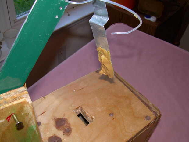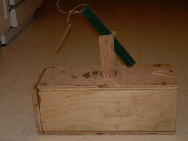 la parte superior de la trampa ahora necesita varios cambios y adición. primero necesita hacer un agujero que si la puerta se pliega plana contra el interior de la trampa el agujero lo golpeará. Esto es donde el cable pasará por sostener la puerta para arriba cuando la trampa se establece. siguiente sobre 4 o 5inches de la espalda hacen una rectangular, me perforó la forma de lo básico hacia fuera y entonces usar un cincel para enderezarse para arriba. este agujero es donde se colocará el gatillo. por último a mitad de camino entre estos dos agujeros que necesitará dos cincel rectangular agujeros a medio camino a través de la madera. Estos deben ser al lado de uno al otro y un poco más grande que las dimensiones de los brazos que sujetan el balancín.