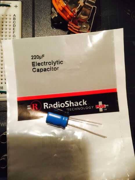 De la soldadura de tapa de 220uF a protoboard - soldadura junto al pin #5 - Asegúrese de que + se enfrenta al pin #5. -Raya hacia el lado derecho del tablero.