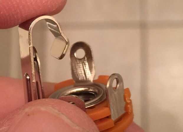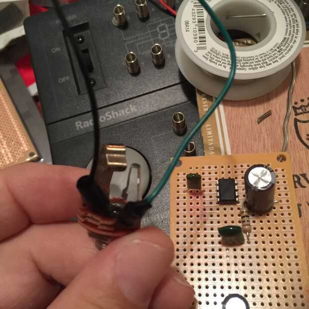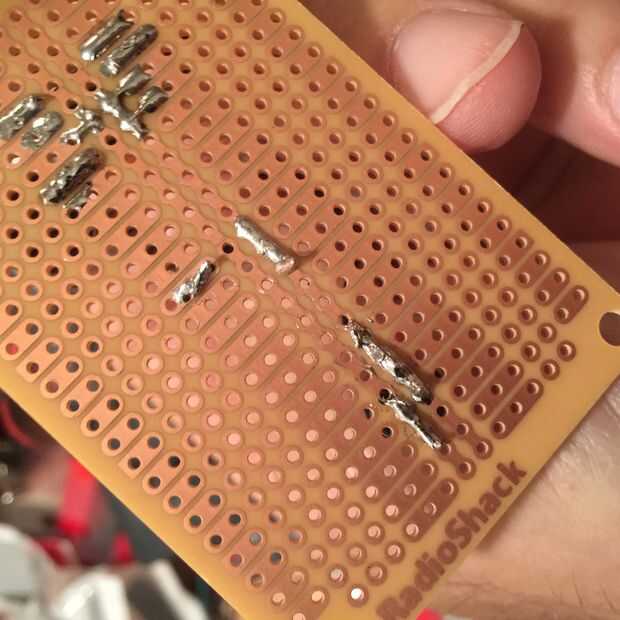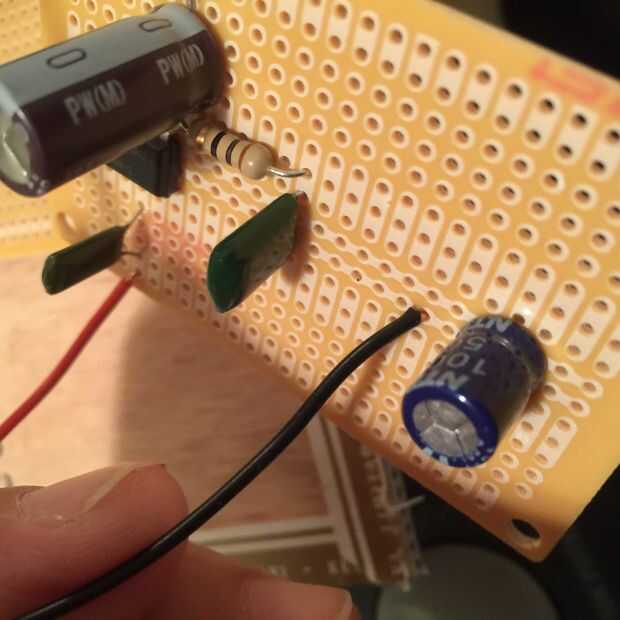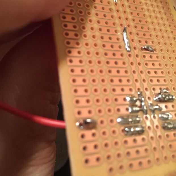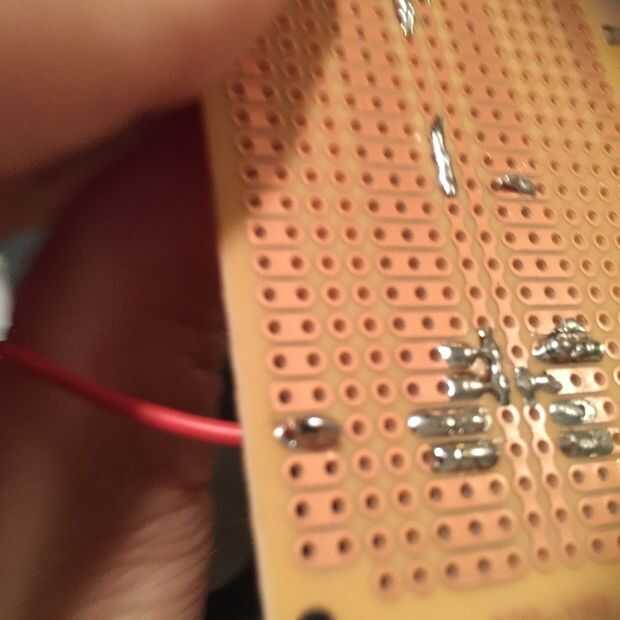 Encontrar el anillo central - que es negativo; lijar o rayar el pin para ayudar a la soldadura del palillo a él. Encontrar el tercer pin anillo - que es el positivo; arena o cero el pin. Soldar los cables en su lugar. Luego Envuelva pins con cinta aislante para ayudar a mantener los cables en su lugar. Soldadura + cable al pin #1 & soldadura - cable a negativo tira en protoboard.