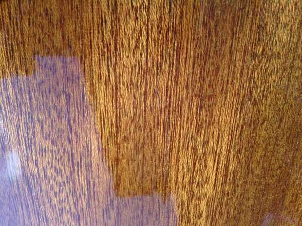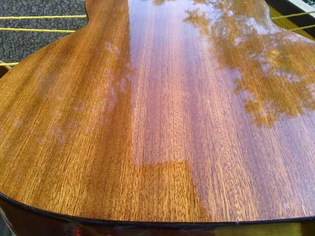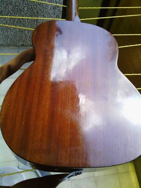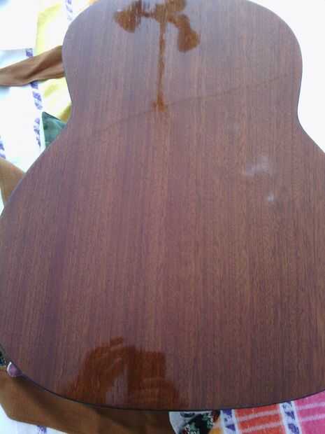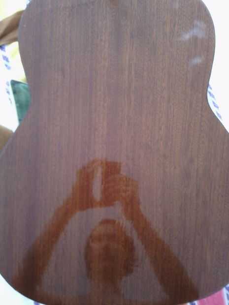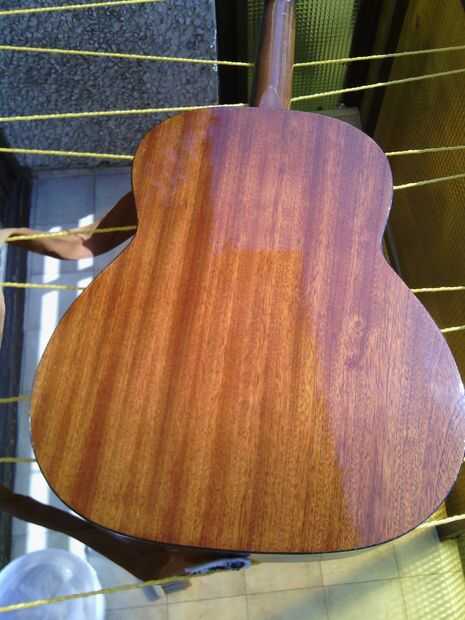 Tiempo para limpiar la parte posterior del cuerpo. Aquí no es nada especial, utiliza algunos Pronto con ropa de microfibra. Bajo la tierra hay un agradable caoba. Puesto que es una guitarra barata es bastante seguro de una madera laminada laminado con chapa de caoba, pero no me importa, es agradable.