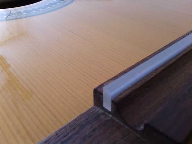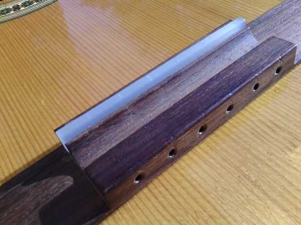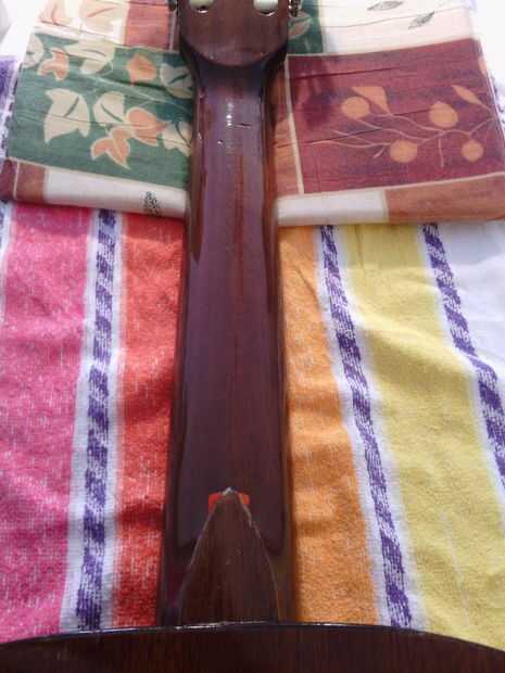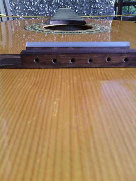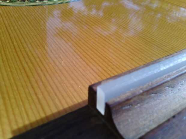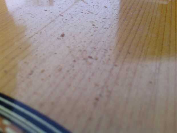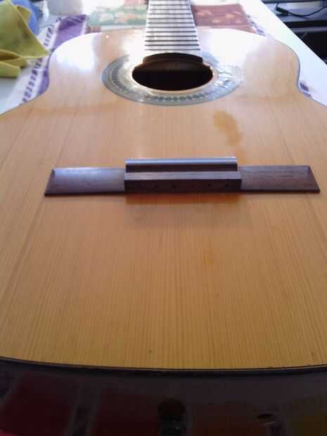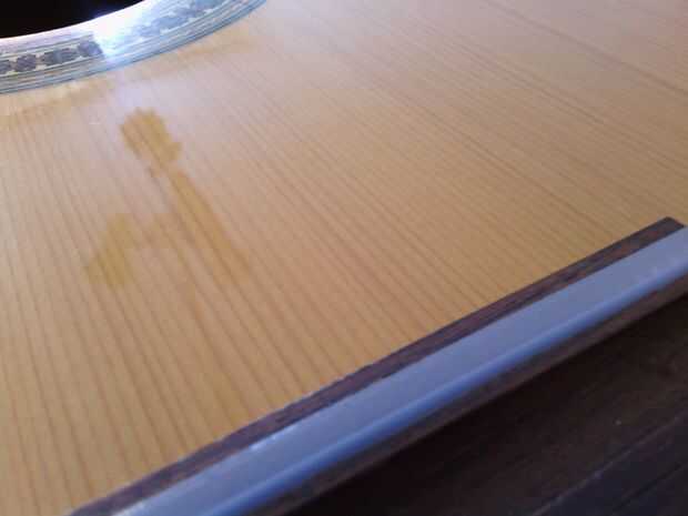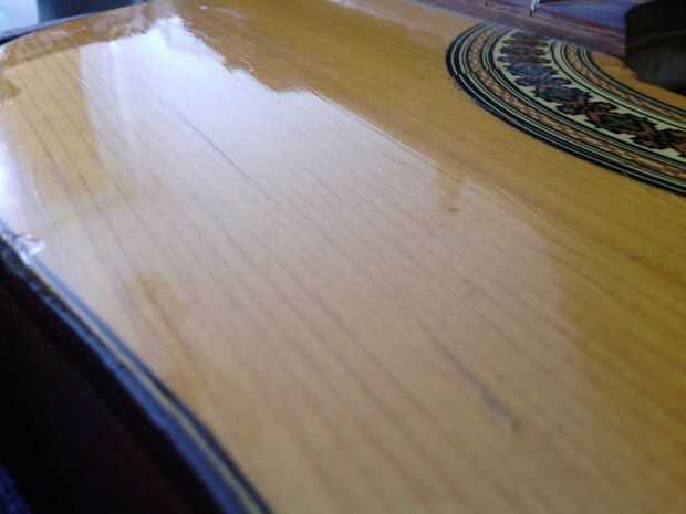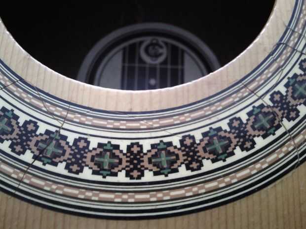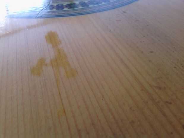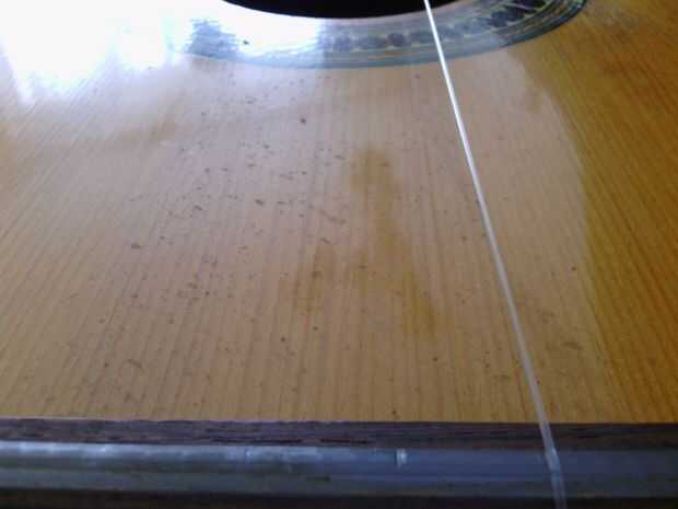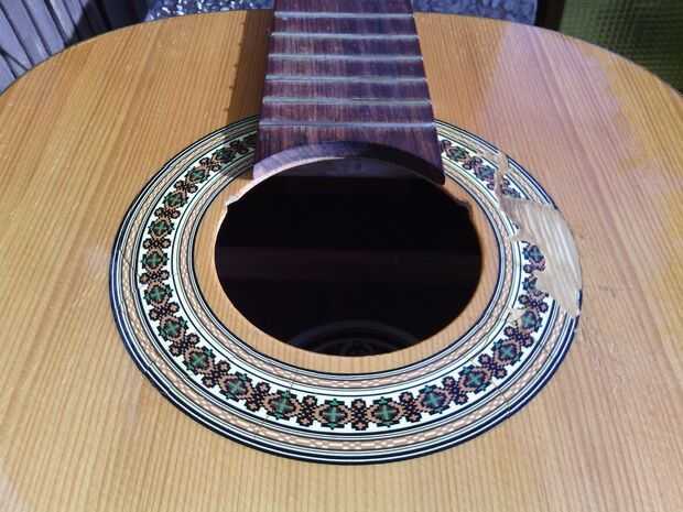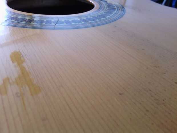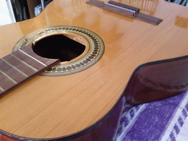 Tiempo de cuidado de la tapa armónica. Trae un reto. La tapa sí mismo es lacada, pero el diapasón y el puente es puro palo de rosa. Necesita cuidados diferentes. Y existe la llamada roseta, en esta guitarra barata es una etiqueta engomada fina debajo de la laca. Lamentablemente su pegamento se debilita con el tiempo la laca comienza a fracturar y finalmente caen algunas piezas. Esta zona es tan floja, debe limpiarse muy cuidadosamente.