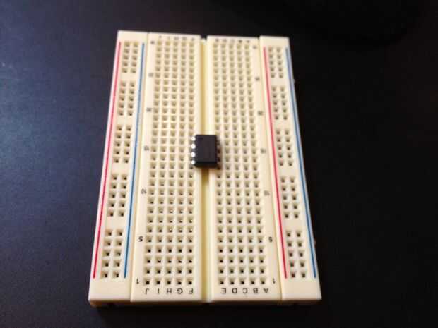 La sección de centro del pan se puede considerar la sección principal. Las filas numeradas constan de 5 perforaciones que están conectadas eléctricamente. Las columnas con letras no están conectadas eléctricamente. Así que para la fila #5 agujeros A, B, C, D y E están conectados eléctricamente. Lo mismo para la fila #5 agujeros F, G, H, I y J. La distancia entre cada conjunto de columnas se adapta perfectamente a varios ICs. Lo más importante, nuestro Temporizador 555 IC.