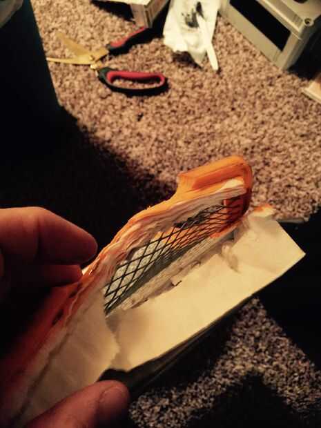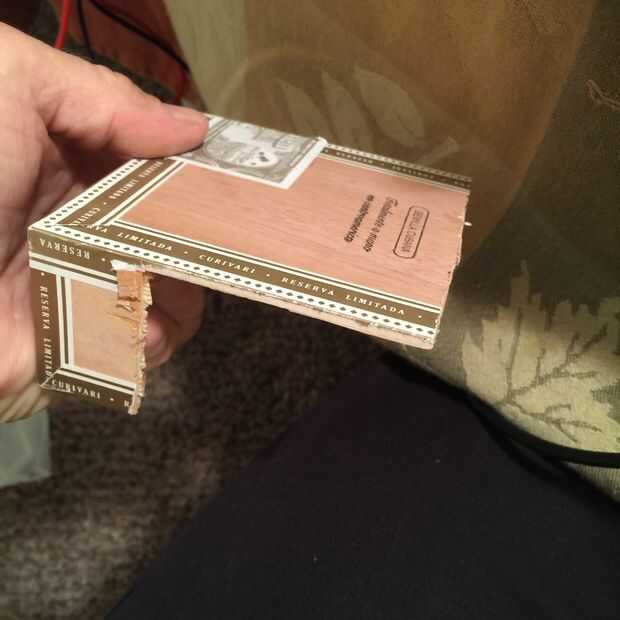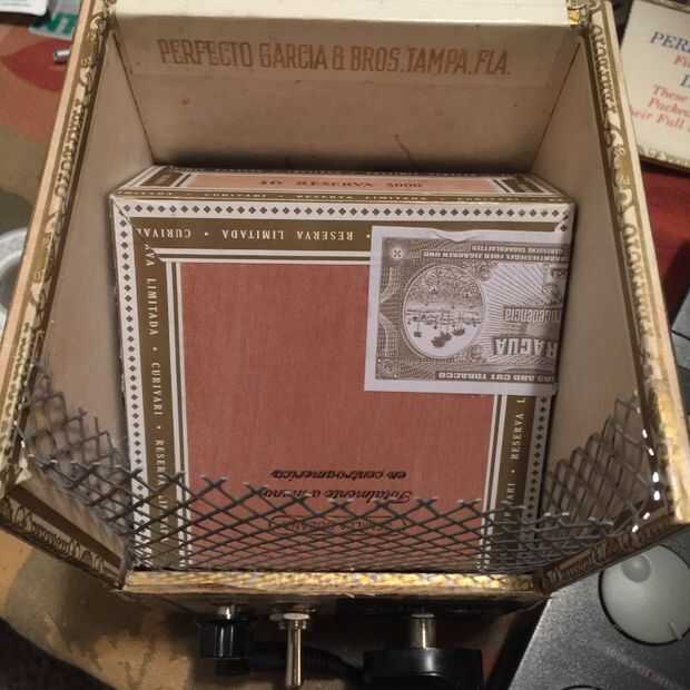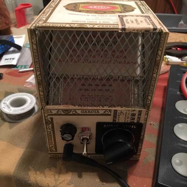 Cut & Drill out your cigar box to hide all amp parts. Montaje de altavoz - estoy usando un altavoz grande de 10 ohmios. Yo no puedo montar en la caja, así que voy a pegar con PC11 para sujetarlo a la parte posterior de la caja. Estoy utilizando otra caja de cigarro para ocultar el altavoz y sellar la caja. Entonces estoy usando la cubierta frontal de la caja de cigarro para ocultar todas partes posterioras de los controles. Entonces, usando un alambre de un filtro de coche viejo para cubrir la parte delantera de la caja. Cortar para caber.