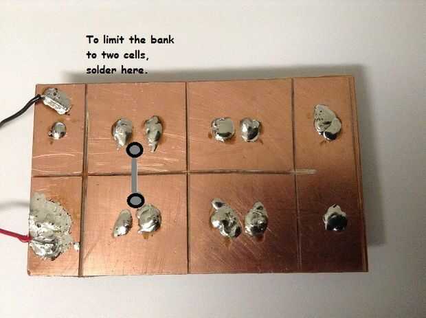 No se limitan al uso de este banco de batería de seis celdas con seis células. Si desea utilizar cuatro celdas, basta con un plomo de la soldadura a través de la separación de ambos de las células del segundo de la parte superior. Si desea utilizar dos células, Solde un plomo a través de la separación de ambos de las primeras células de la parte superior.