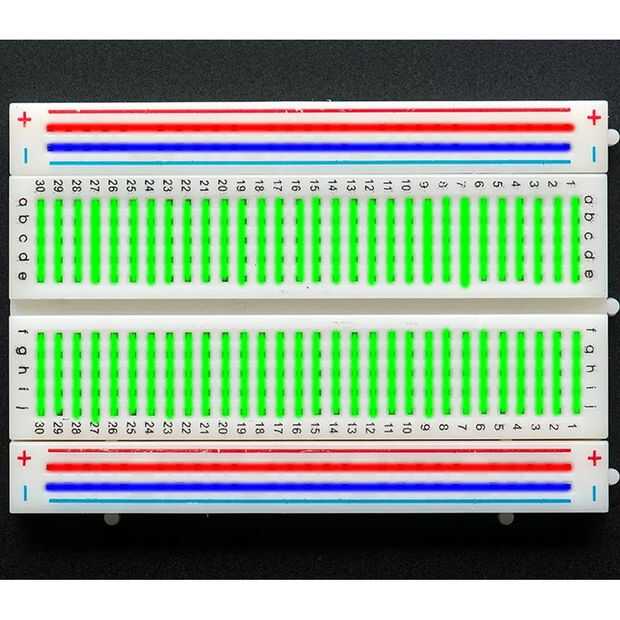 En el primer diagrama de arriba muestra un diagrama de un protoboard. En la imagen, puedes ver que caminos en el tablero de pan están marcados en rojo, verde y azul.